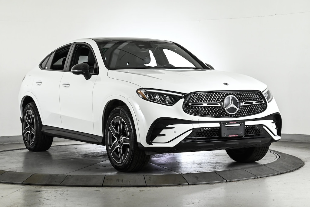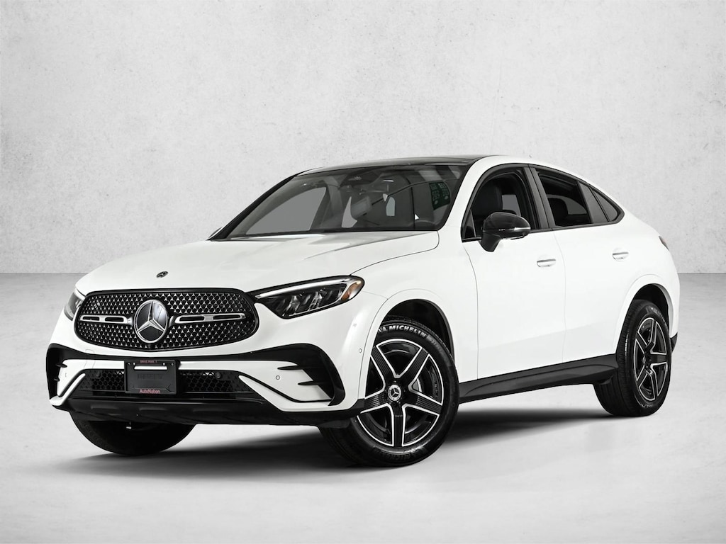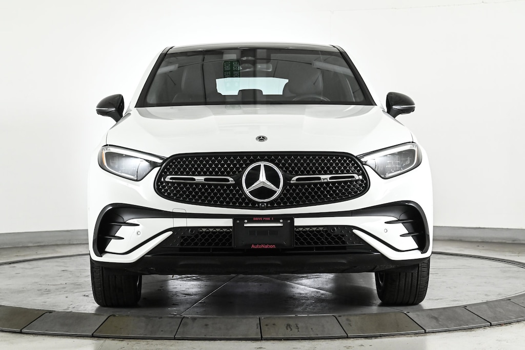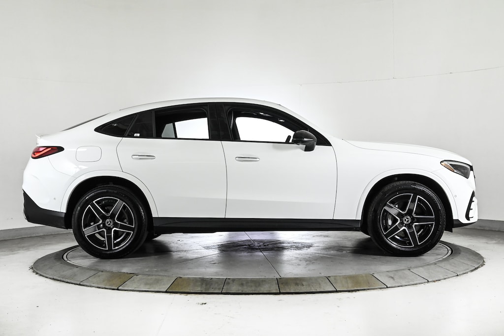 Certified 2025 X Loaner GLC300C4 All Wheel Drive Polar White/AMG Black MB-Tex with AMG Line Package, Night Package, Heated Steering Wheel, Illuminated Star, Illuminated Door Sills, Rear Spoiler/Body Color, Animated LED Logo Projector, Fineleline Anthracite Wood Trim & 19 AMG 5-Spokje Wheels w/Black Accents