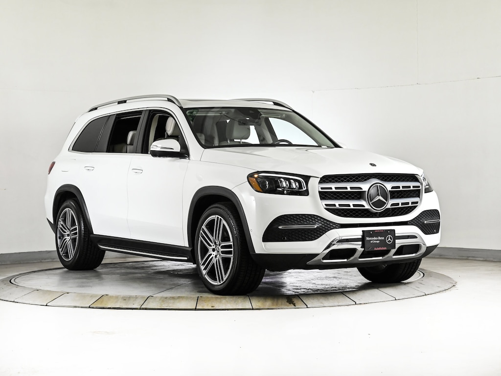 2021 Mercedes-Benz GLS 450w4 in Polar White on Macchiato Beige / Black MB-Tex. All-wheel drive, 21'' Triple 5-Spoke Wheels, Captain Chairs (6 seater,) Trailer Hitch, Augmented Video for Navigation, PARKTRONIC with Active Parking Assist, Blind Spot Assist, Sunroof, Heated and Ventilated Front Seats, Illuminated Running Boards, 5 Zone Climate Control, Roof spoiler, Power tailgate, and MORE!!